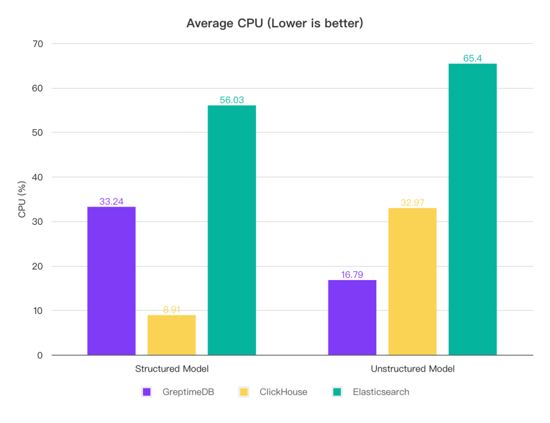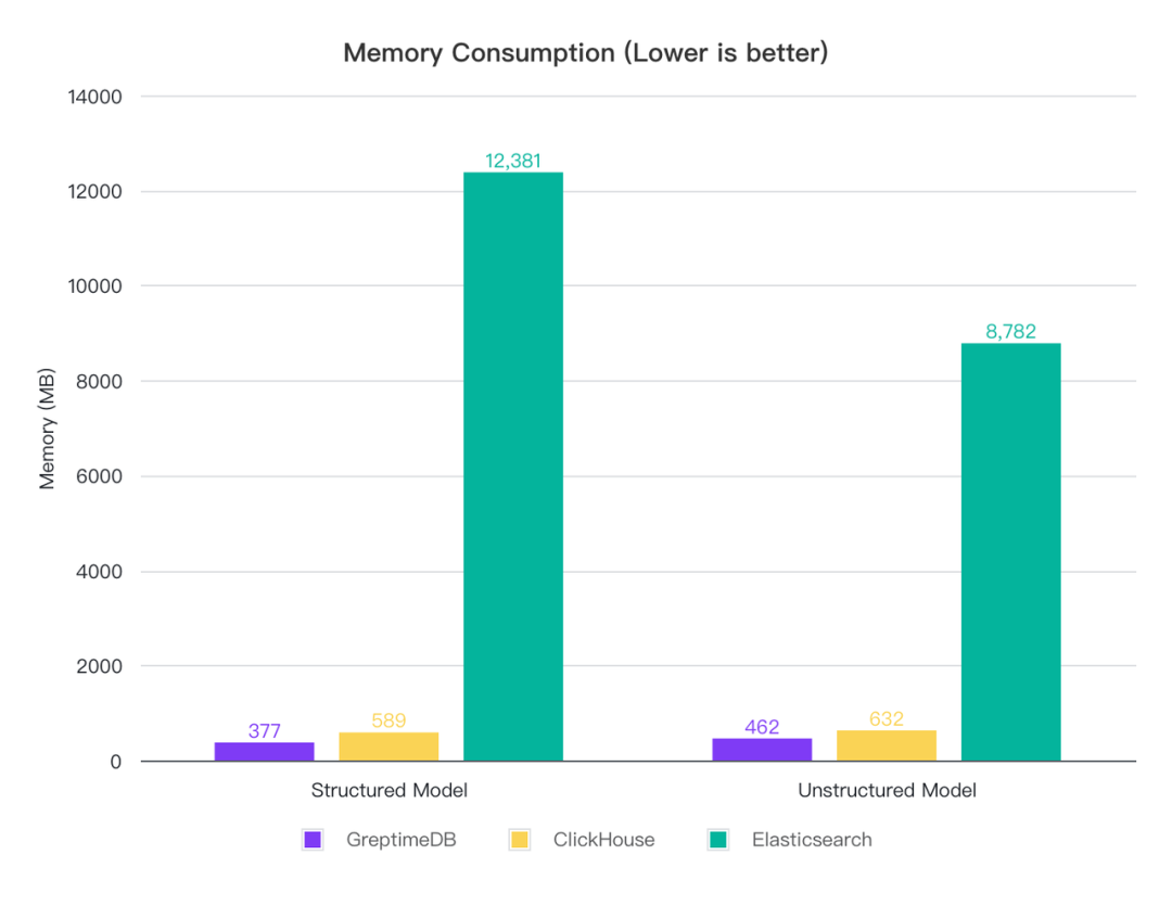 切分模式下,ClickHouse 的 CPU 消耗最低,GreptimeDB 其次, ES 消耗较高,是 CH 的 6 倍, GreptimeDB 的 1.7 倍,内存上 GreptimeDB 消耗最低, ClickHouse 其次,而 ES 的内存占用超过了 12 G,是 CH 的 21 倍, GrptimeDB 的 32 倍;