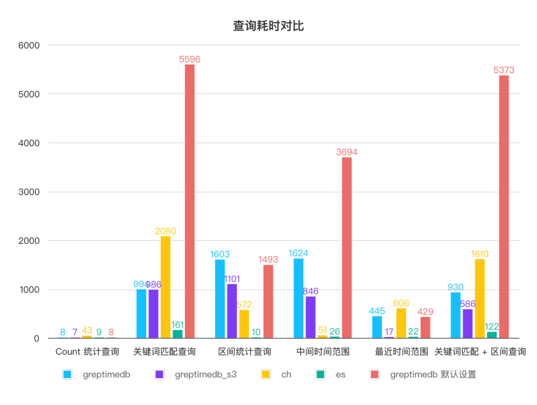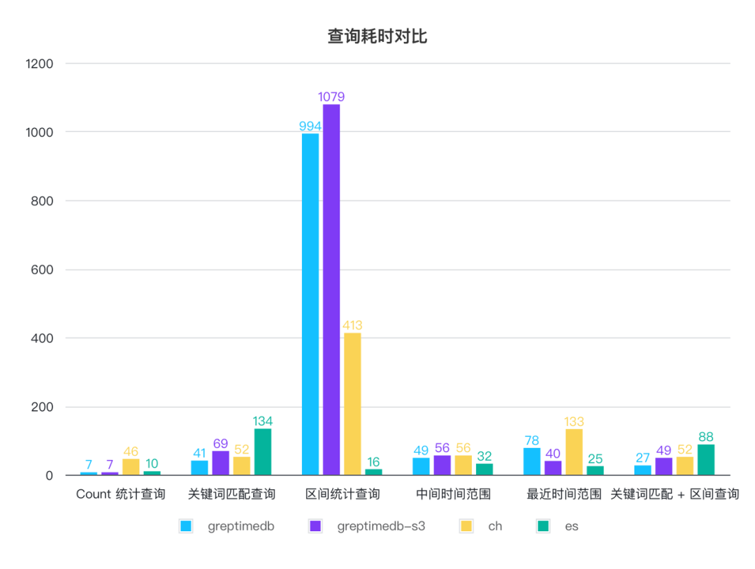 GreptimeDB 默认配置的查询性能除了最近时间范围查询以外都最差,在修改默认配置后,所有查询耗时都可以在 1.6 秒内完成,部分查询比 CH 更快,比如最常见的关键词匹配+时间区间范围查询。ES 的查询性能最优,较大的内存占用和更优化的索引实现带来来更好的查询性能, CH 表现较为均衡。