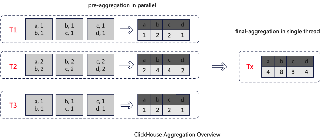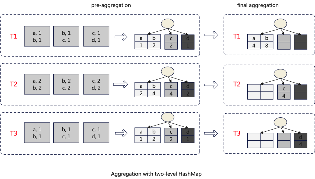 如下图所示,T1 T2 T3是三个线程,每个线程接收数据,并独立的将数据进行初步聚合(pre-aggregate),聚合的数据存储在一个HashMap中,等所有的数据完成初步聚合后,将初步聚合的中间结果进行二次聚合(final-aggregate),考虑到并发问题,这一步需要在单线程中执行,并最终得到一个完全聚合的HashMap,也就是最终结果。