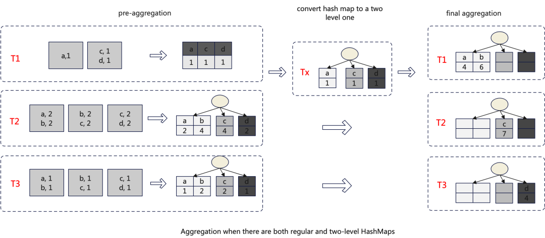 每个pre-aggregate线程独立选择是否是用Two-level HashMap的,那么在进行第二次聚合的时候输入可能既有常规HashMap也有Two-level Hashmap,对于这种情况会在final-aggregate前先将常规HashMap转换成Two-level的。整体的算法如下图所示: