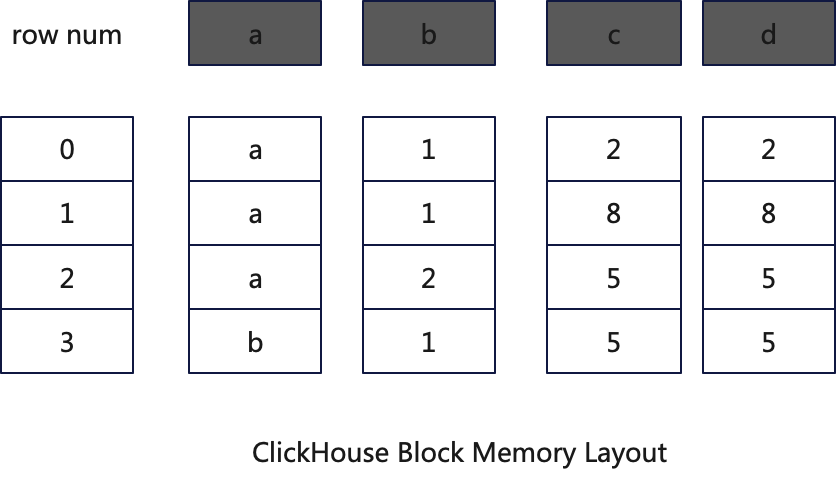 ClickHouse的计算引擎是一个面向列的计算引擎,运行时数据在内存中的存储与处理也是以面向列的,算子的每次输入被称为Block。Block是n个列组成的二维表,其内存layout如下图所示: