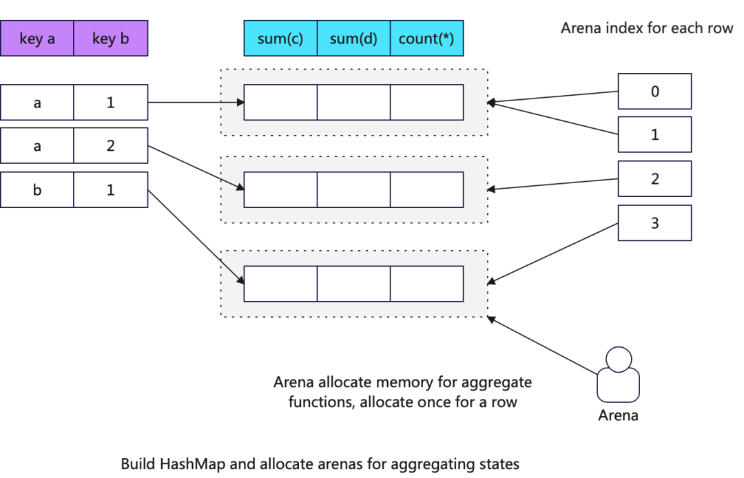 对于每一行判断聚合key在HashMap中是否存在,不存在则将其插入到HashMap中,并通过Arena申请聚合函数状态需要的内存,并在内存中初始化聚合函数的状态对象的内存结构,注意这里只分配key对应value的内存空间,并不会执行聚合操作。