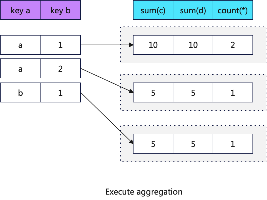 构建好HashMap后就可以执行聚合操作,这里根据聚合函数状态对象的地址索引快速定位到聚合函数的数据地址,然后应用每个聚合函数。下图展示了聚合后的HashMap