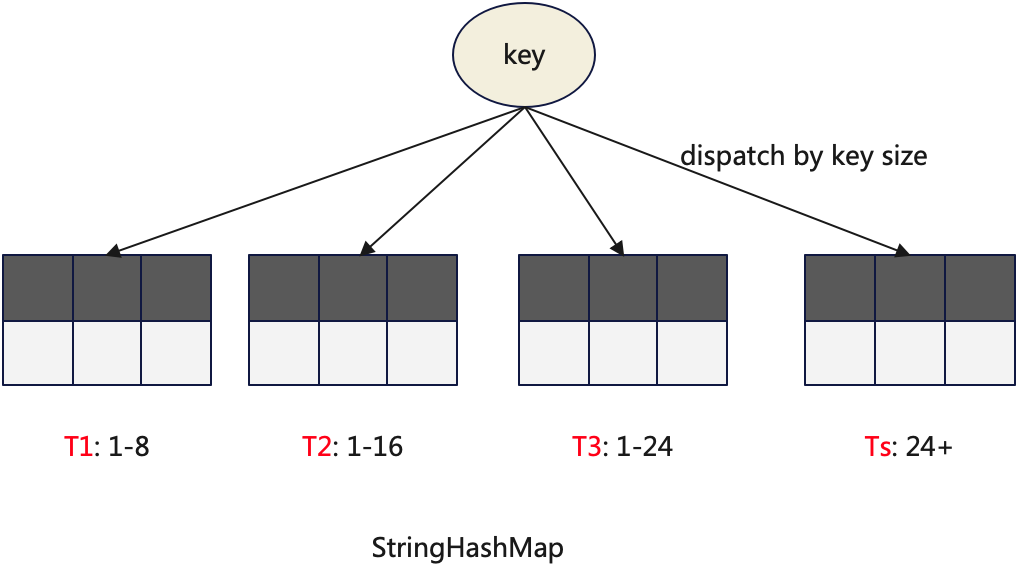 StringHashMap用于存储String类型的数据,是一个非常常用的HashMap。其本身是一个复合型的数据结构,内置多个常规的HashMap,根据key的长度将数据路由到不同的HashMap中。