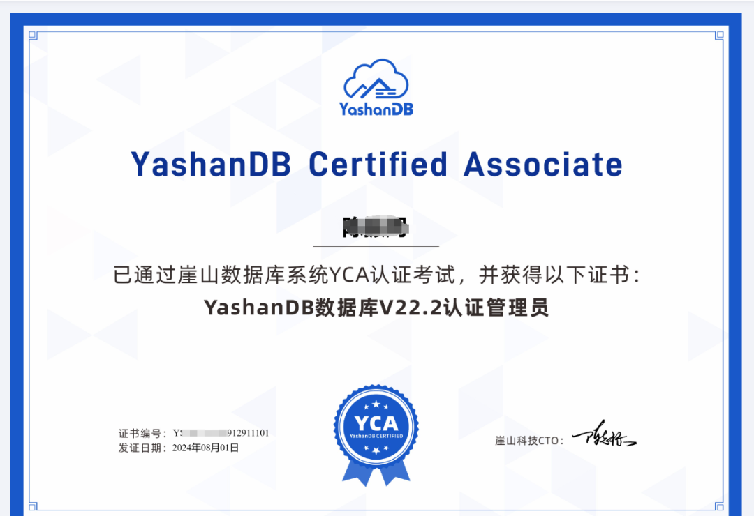经过系统性的学习了崖山数据库的YCA课程,我对崖山数据库形成了一个基本的认识,下面我举几个该数据库的优点。首先师出名门,深圳计算科学研究院是它的创建者,其代码质量及业务逻辑想来是有技术团队托底的;再者该数据库通过了工信部的权威检测,内核代码自主率100%,纯国产数据库当之无愧;最后就是其创新地提出了有界计算(BQP,Bounded Query Processing)的大数据查询分析方法,令人印象深刻。该数据库同时也降低了DBA的学习成本,并不会为了国产而“国产”,使得大批从事Oracle数据库的DBA们能够轻松得切换为崖山数据库的DBA,令人好感倍增。经过几天的学习,我也顺利通过了考试,并取得了证书。