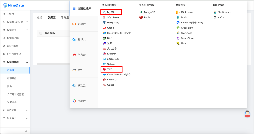 1. 登录 NineData 控制台,单击数据源管理>数据源,然后在页面中单击创建数据源,选择需要录入的数据源。