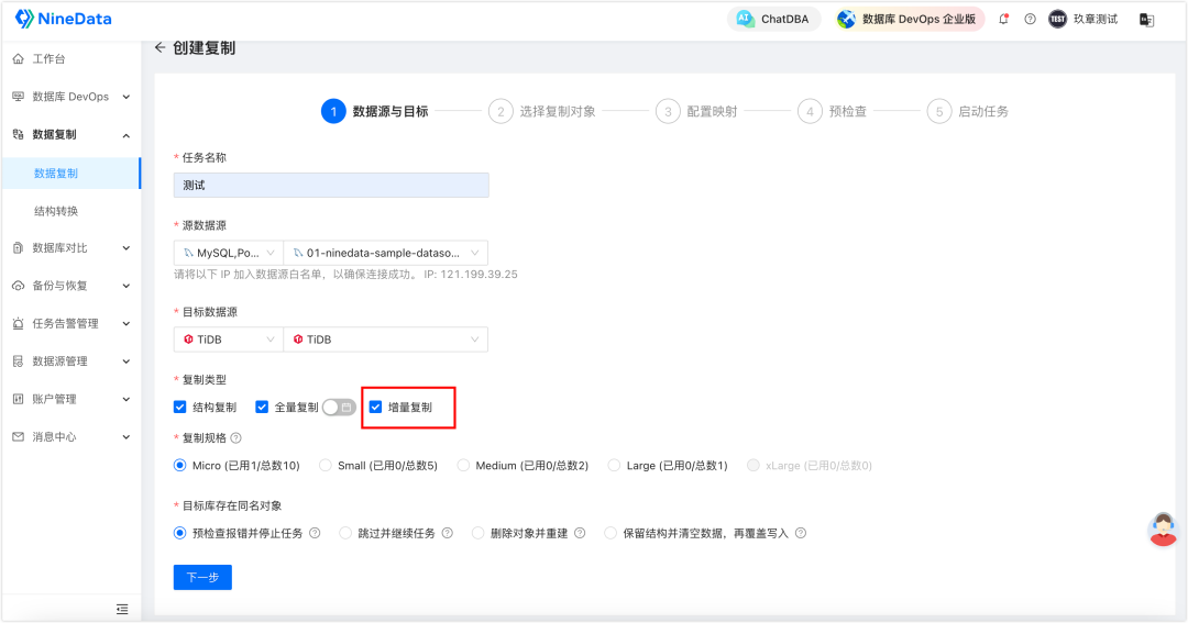 2. 根据页面提示配置复制任务,由于我们想要实现不停机实时数据迁移,需要在复制类型处额外勾选增量复制。