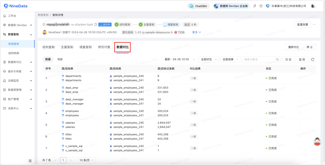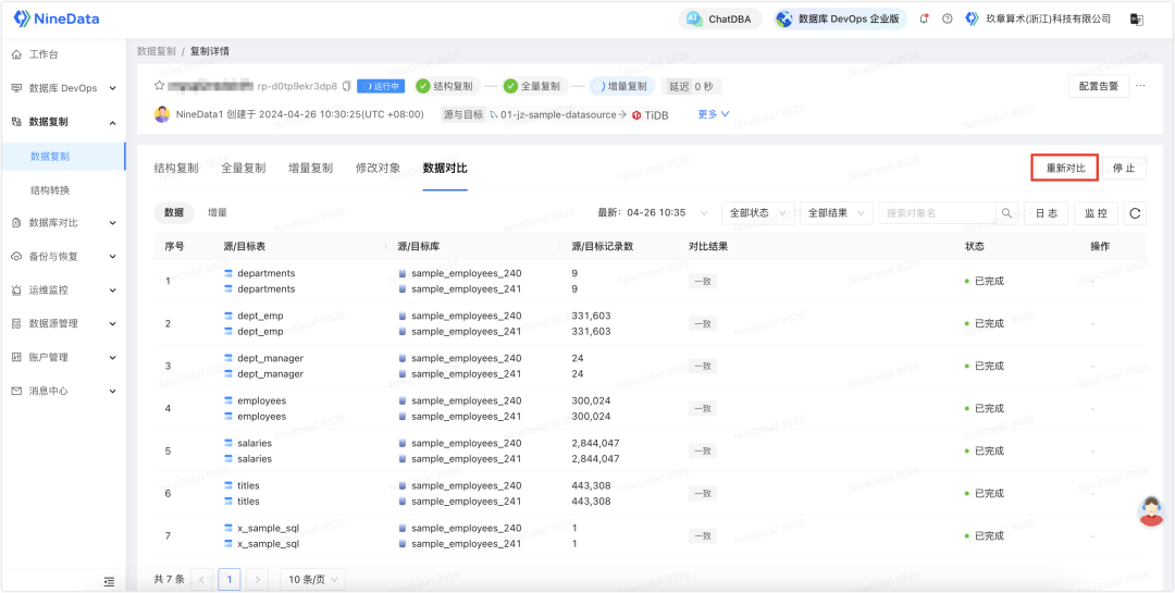 除了同步功能以外,NineData 还提供了同步后源端和目标端同步数据的对比功能,以确保目标端数据的完整性。