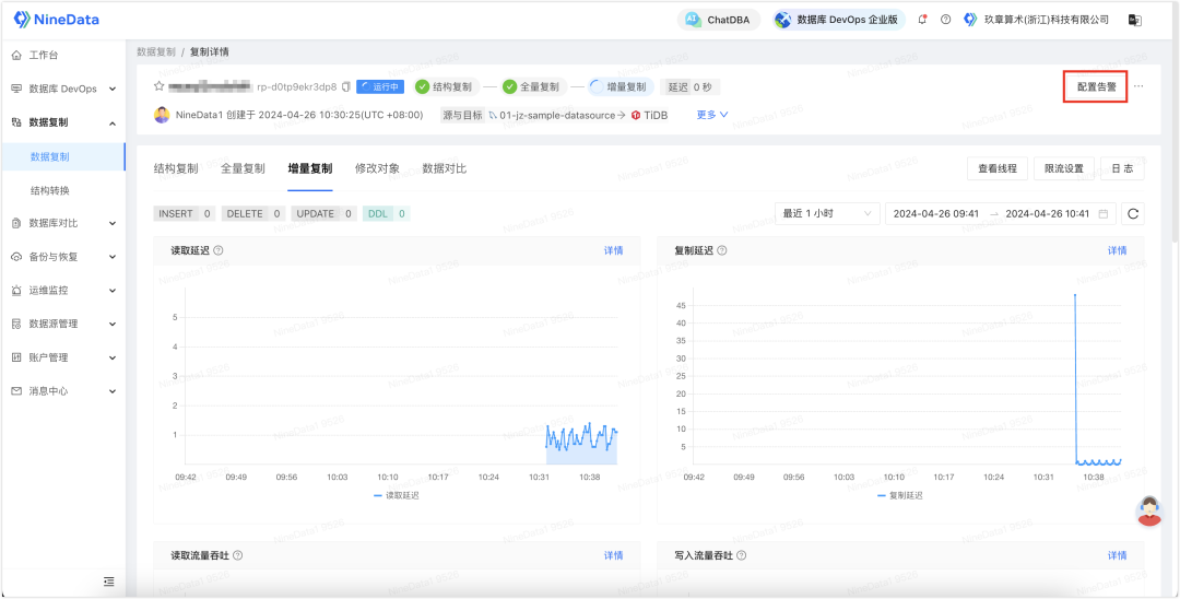在数据库迁移过程中,迁移速度无疑是影响业务能否成功切换割接的重要因素。在此过程中,NineData 针对 MySQL > TiDB 数据复制进行深度性能优化,基于日志分析、智能分片、动态攒批、数据合并、特有数据格式等技术,有效保障全量数据复制、增量数据复制的性能。当前 NineData 全量复制性能高达 200 GB/小时,增量数据复制性能高达 2 万记录/秒。