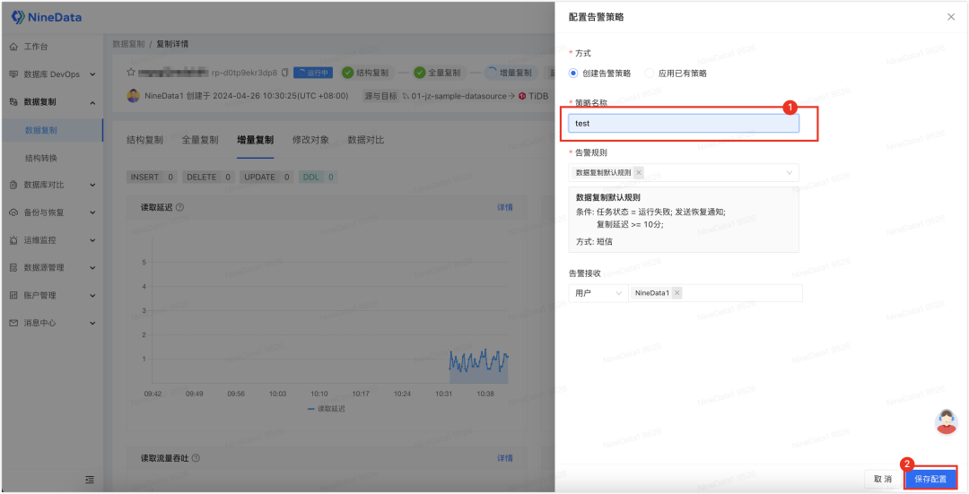 3. 输入策略名称,单击保存配置即可。您可以直接使用内置的默认规则,在任务运行失败,或复制延迟大于等于 10 分钟的时候,发送短信提醒您。您也可以自定义创建规则,根据您的需求来进行通知。