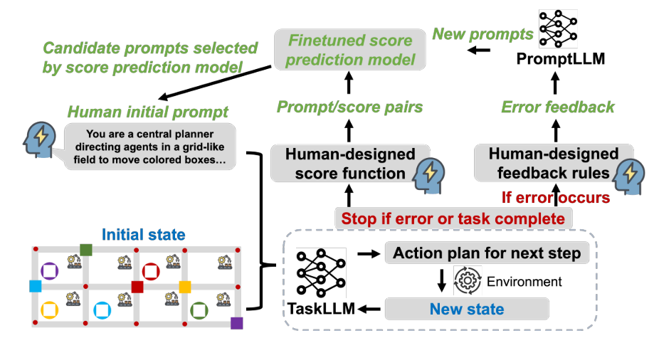 评分函数:候选提示词P会根据人类设计的评分函数获得一个分数。每个候选提示词会在多个试验中被评估,这些试验中环境的初始状态(如对象数量、代理数量等)会有变化。所有试验的平均分数构成了最终的平均得分。