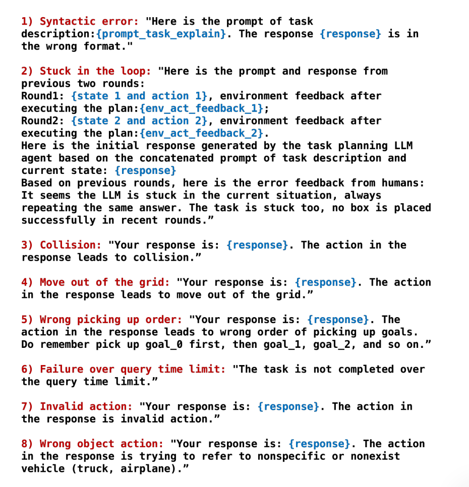 自动反馈规则:由于语言模型难以自动分析多步骤任务中的错误,系统采用了人为设计的规则来生成反馈。这些规则可以根据发生的错误类型自动合成反馈信息。 通用与特定反馈:反馈规则可以分为两类:一类是适用于所有任务的通用错误类型(例如语法错误),另一类则是针对特定任务的特定错误类型。 设计过程:设计这些反馈模板的过程相对简单直接,不需要大量的尝试和错误修正。 简而言之,当TaskLLM遇到错误时,系统使用预先定义的人为设计的规则来生成反馈信息,这些信息可以帮助PromptLLM更好地理解问题所在,并生成更有效的提示来解决这些问题。这种方法避免了通过复杂的自动分析来识别错误,而是依赖于简单的规则来提供有用的反馈。下图为人工设定的8个反馈规则的例子(机器人行动的例子)。