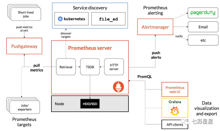 Prometheus 算是一个全能型选手,原生支持容器监控,当然监控传统应用也不是吃干饭的,所以就是容器和非容器他都支持,所有的监控系统都具备这个流程,数据采集→数据处理→数据存储→数据展示→告警,本文就是针对 Prometheus 展开的,所以先看看 Prometheus 概述