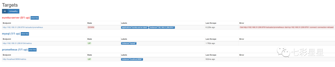 这里显示了在prometheus里配置的两个抓取任务,不过eureka-server任务是失败的,state是down,接下来我们需要配置下eureka-server服务才能让prometheus抓取数据。
