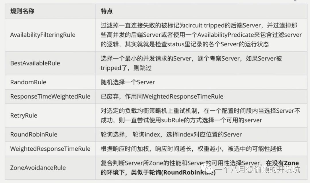 服务选择规则:通过 LoadBalancerInterceptor 进行拦截请求,并根据具体的 IRule 实现来进行负载均衡,默认轮询算法,并且可以更换默认的负载均衡算法,只需要在配置文件中做出修改;