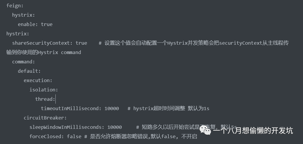如果开启了 Hystrix,此时 Ribbon 的超时时间和 Hystrix 的超时时间的结合就是 Feign 的超时时间,当 Hystrix 发生了超时异常时,可以如下配置调整 Hystrix 的超时时间: