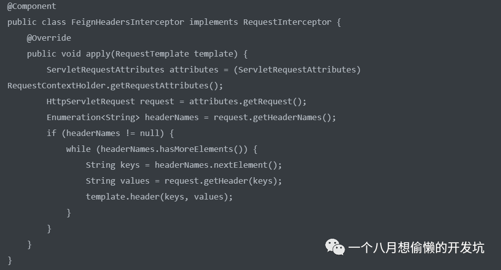 默认情况下,当通过 Feign 调用其他的服务时,Feign 不会带上当前请求的 headers 信息的;