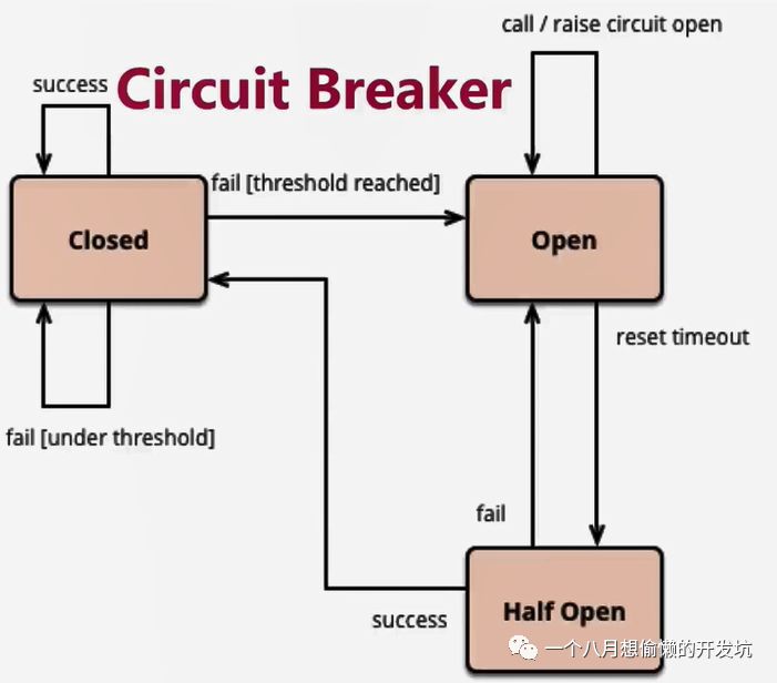 服务熔断:CircuitBreaker 断路器,当失败率达到阀值自动触发降级(如因网络故障 / 超时造成的失败率高),熔断器触发的快速失败会进行快速恢复;