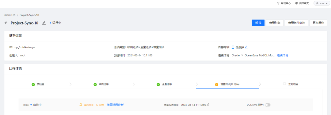 日志回放 的状态为阻塞(红色),其延迟时间为 11 分 52 秒,和增量同步延迟时间基本一致,表示增量记录都阻塞在回放阶段。导致最终目标端的数据延迟也为 12 分钟左右。