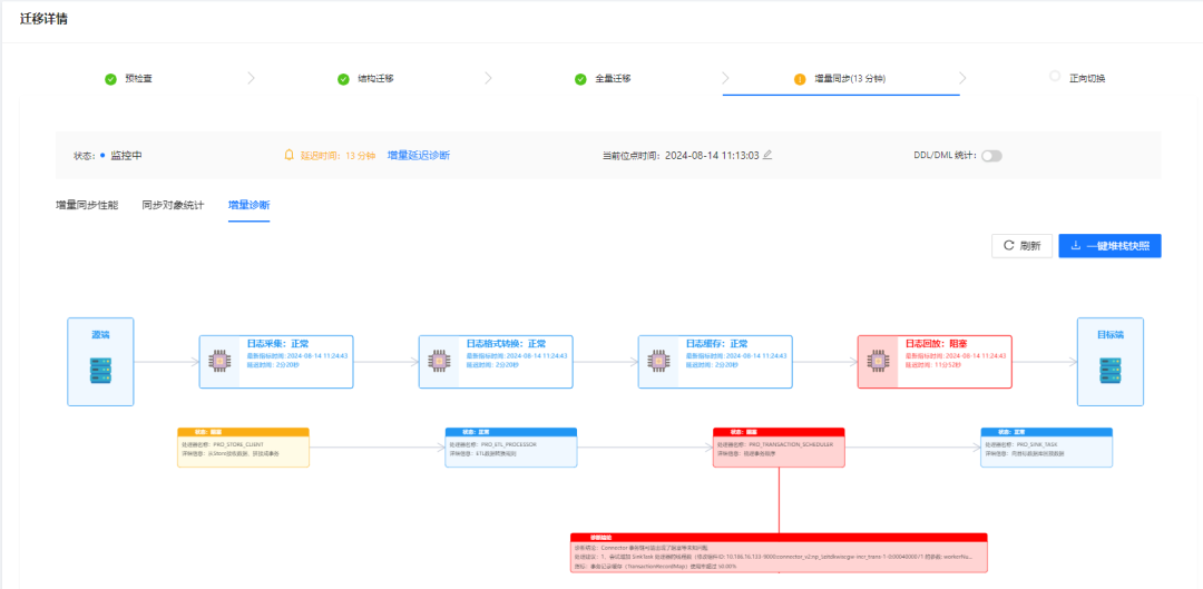 针对上图中出现的增量同步达到了 12 分钟,并且延迟时间还在一直上涨的情况,通过新增的增量延迟诊断功能,我们可以看到数据同步过程中关键节点的延迟情况、出现问题的节点以及对应的处理建议。