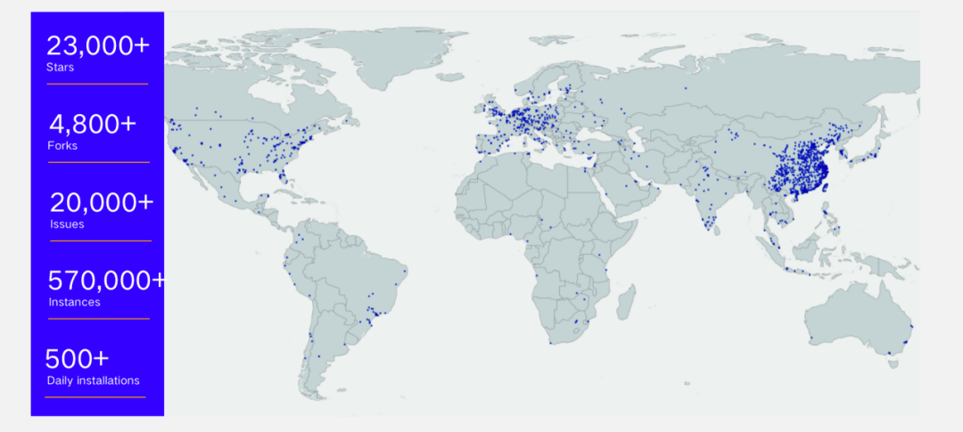 在这样的一个发展趋势下,TDengine 在全球的用户数量也在急剧增长。截至目前,TDengine 在全球已运行超过 57 万个实例,每天新增 500 多个实例。如下图所示,尽管我们在台湾省和欧洲等地尚未设立办事处,但依然有大量用户在使用我们的产品。