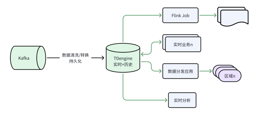 基于 TDengine,我们提出了一种简化的数据处理方案。通过对数据进行一次持久化和清洗,确保在数据进入前就完成治理,避免后续的重复处理。下图中绿色的这几条线代表结构化数据在进行消费,你可以从 TDengine 的实时和历史数据库中用 Flink 对它进行订阅消费,可以把它推送到任何数据源目的地。你的实时应用也可以利用 TDengine 内嵌的消息订阅接口来进行数据订阅,数据可以消费出去,也可以处理后再回写回来。除此之外,应用还可以通过 TDengine 的实时查询方法获取最新数据,驱动相关业务。