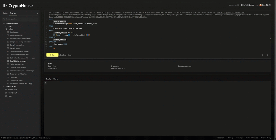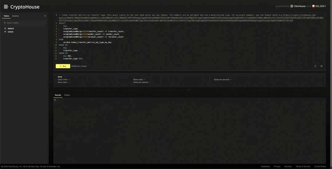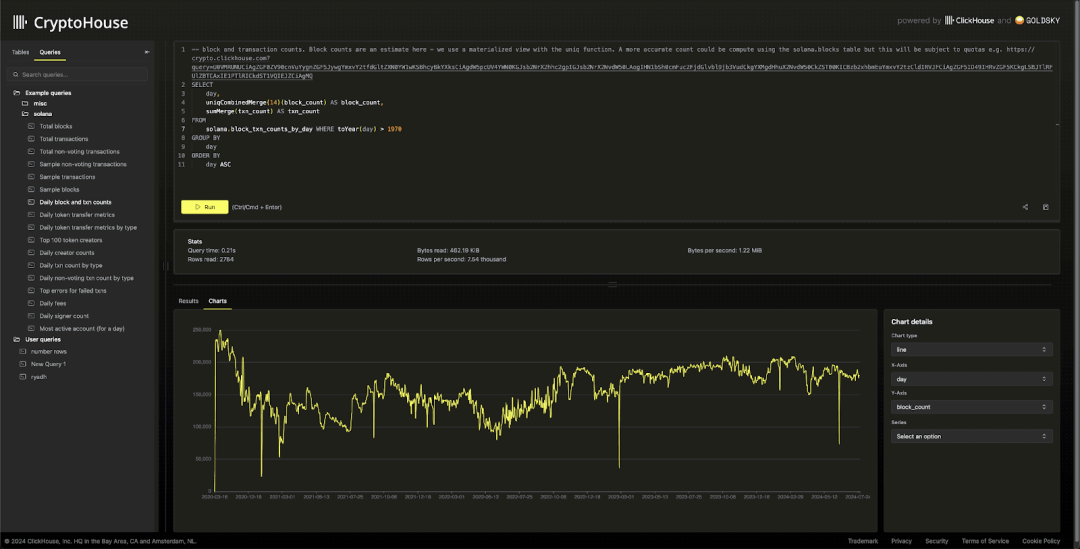 现有的公共区块链分析服务通常需要定期的异步查询,而 ClickHouse 则提供了实时分析,通过实现即时查询响应,降低了访问门槛。用户可以使用 SQL 查询这些由 Goldsky 实时更新的数据,并且完全免费。我们定制的用户界面支持保存和共享查询,并提供基本的图表绘制功能,还附有示例帮助用户快速入门。我们欢迎外部贡献示例查询,共同提升这项服务。