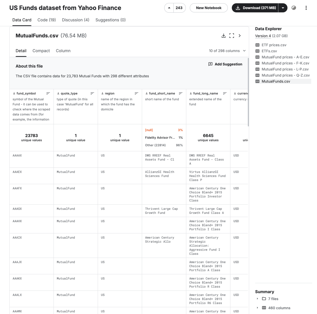 US Funds dataset from Yahoo Finance是Kaggle上的一个数据集,该数据集包括从 Yahoo Finance 收集的财务信息,包括所有美国共同基金、ETF及其历史价格。更新版本涉及 2021 年 11 月的数据。该数据集包含 23,783 只共同基金和 2,310 只 ETF,其中包括: