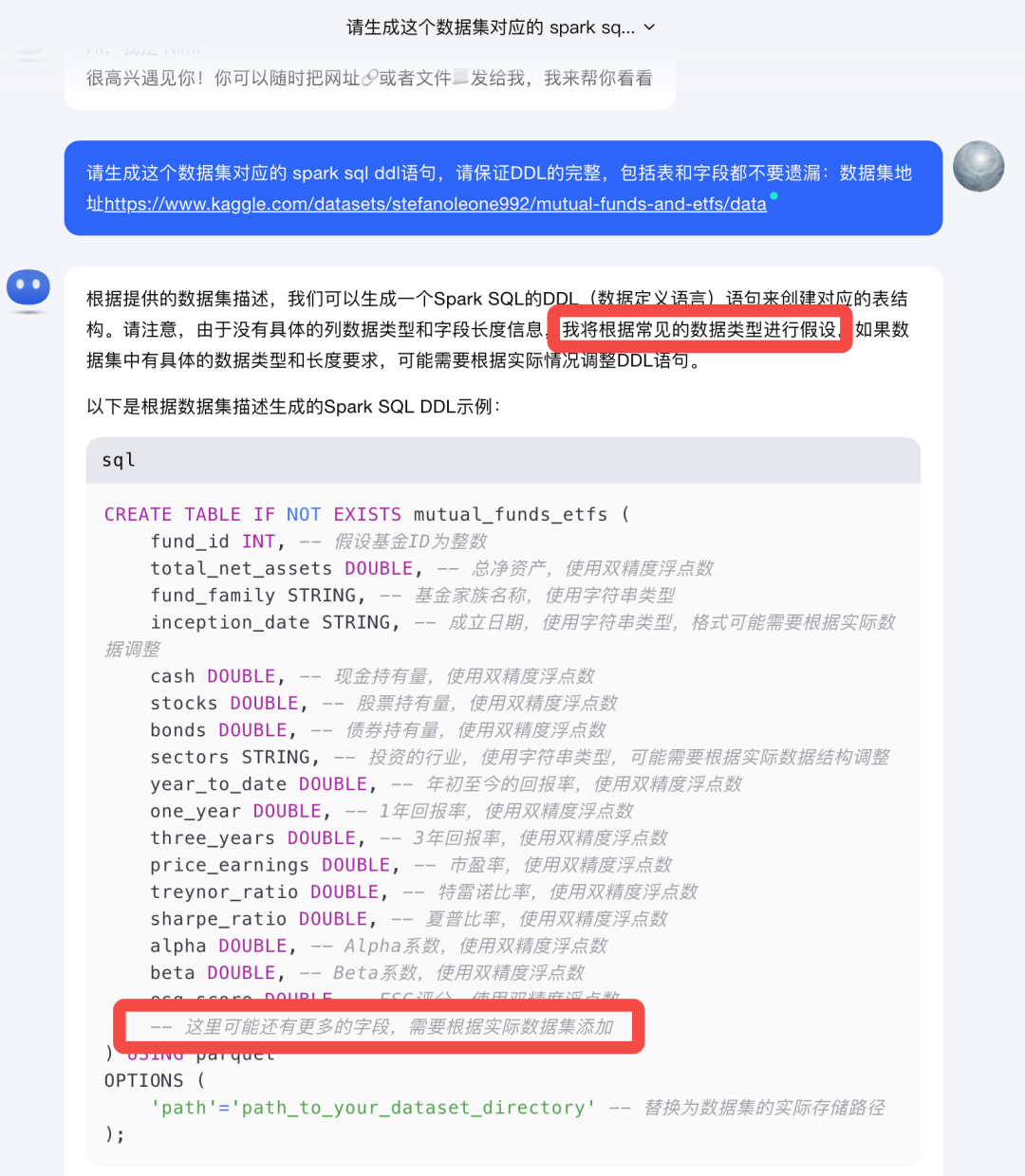 不同于玩玩具的玩数据,只是一个简单的表,10来个字段,手写一把,问问大模型,都可以很快的生成需要的DDL语句。话说有460个字段,近亿行数据,手写是不行的。试试Kimi吧,看看Kimi能不能帮上这个忙。