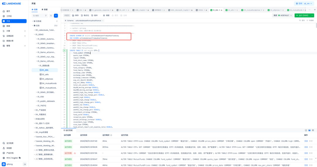 云器Lakehouse内置了SQL IDE开发界面,将Python生成的SQL DDL语句COPY进IDE执行即可,在执行之前,先创建一个schema,并且指定使用该schema: