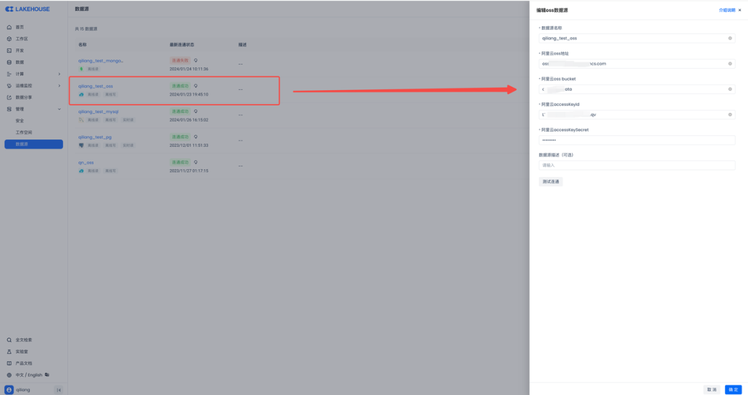 然后在云器Lakehouse里新建一个数据源,连上阿里云OSS: