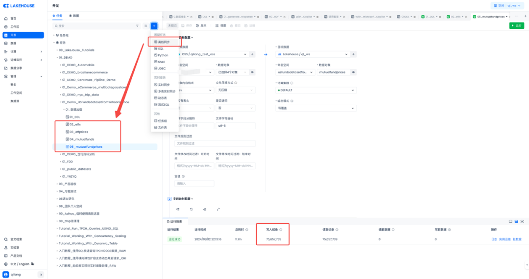 想想,云器Lakehouse内置的数据加载功能,还有离线同步这种方式。但是不支持从本地文件同步,那就把数据放在阿里云的对象存储,从对象存储OSS加载到云器Lakehouse的表中。