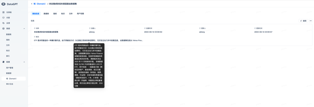 域(Domain)划分:将数据集表、指标、文件等对象,按照不同业务域进行隔离,避免产生歧义;如:销售业绩在财务域与销售域的指标定义。本实验中为US Funds dataset from Yahoo Finance数据集及相关指标创建了如下单数的域(Domain):