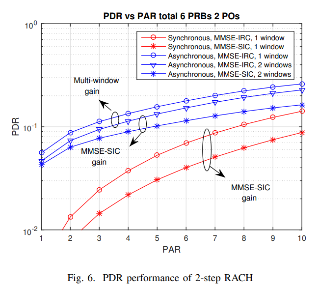 从图6中可以看出,两条红色曲线之间的比较表明,在同步传输中,MMSE-SIC接收机通过更有效地解决UE复用问题,与MMSE IRC(干扰抑制组合)接收机相比可以提供相当大的增益。10%PDR时可支持的数据包到达率已从8增加到10以上。