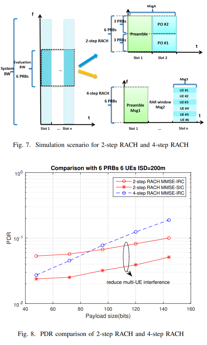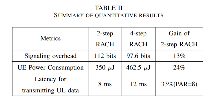 两步RACH可以简化随机接入过程,从而具有以下方面的优点:信令开销、功耗和传输UL数据的延迟。定量分析总结见表。根据性能评估,2步RACH在同一资源中支持大量复用UE。与4步RACH相比,使用MMSE-IRC接收机时,2步RACH在更大的有效载荷大小下表现出更好的性能,在更小的有效载荷尺寸下表现出更差的性能。此外,使用多窗口MMSE-SIC接收机,可以进一步提高2步RACH的同步和异步性能。