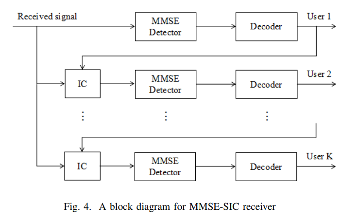 MMSE-SIC接收机具有相对较低的复杂度和稳健的性能,用于从叠加信号中连续解码多个用户的信号,如NOMA。