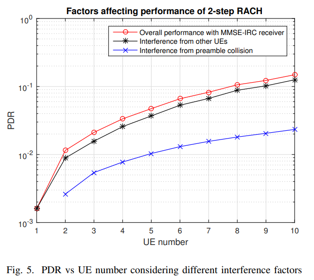 如图8所示,当有效载荷相对较小时,多UE干扰的影响大于较低码率的优势。当有效载荷大小增加到更高时,4步RACH UE的码率迅速增加,性能变得比使用MMSE-IRC接收机的2步RACH差。此外,MMSE SIC接收机可以通过减少多UE干扰来显著提高2步RACH的性能,使2步RACH性能始终优于4步RACH。