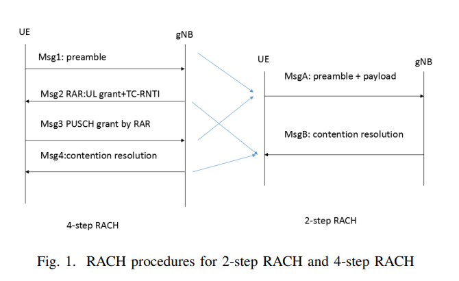 在传统的4步RACH[1]中,UE和BS之间有两个UL/DL交互,其中第一个交互是通过使用在物理随机接入信道(PRACH)上传输的前导序列(Msg1)来计算定时提前(TA)。然后,对于第二次交互,UE应用TA在交付给BS的调度资源上传输UE身份(Msg3),以便网络和UE对用于后续数据传输的UE特定信息,即小区无线网络临时标识符(C-RNTI)有共同的理解。