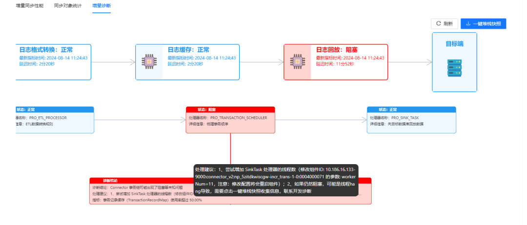 针对上图中出现的增量同步达到了 12 分钟,并且延迟时间还在一直上涨的情况,通过新增的增量延迟诊断功能,我们可以看到数据同步过程中关键节点的延迟情况、出现问题的节点以及对应的处理建议。
