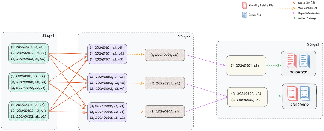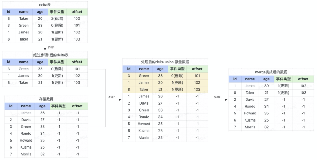 以上通过一个实例详细说明了数据合并流程:首先将当天生成的 Binlog 数据存储到 Delta 表中,然后与已有存量数据基于主键取最大 Offset 进行合并。