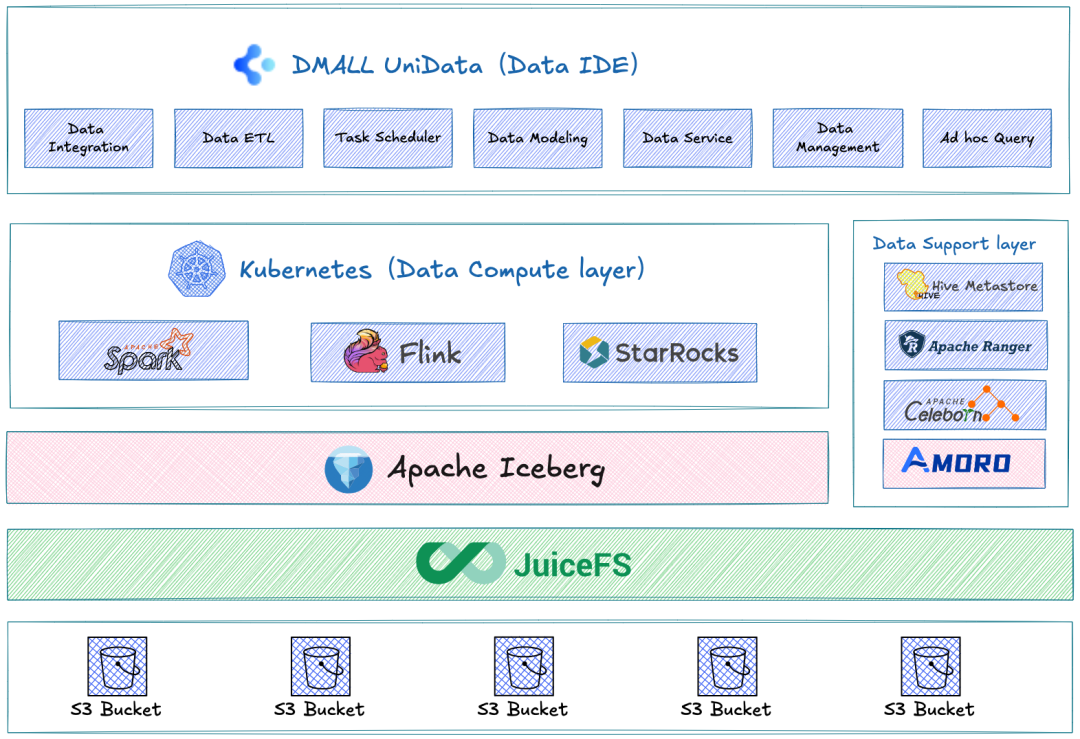 多点 DMALL 为行业提供全方位的零售数字化解决方案,而为了满足越来越多 B 端客户的需求,我们需要在多云环境下构建更具性价比、可复用的大数据底层基座和平台工具链。为此,多点 DMALL 大数据团队充分利用已有经验,引入 Kubernetes、JuiceFS、Apache Kyuubi、Apache Celeborn 等开源技术,并结合未来业务需求,设计构建了一整套基于云原生的大数据集群架构,达成了存算分离、轻量级、可扩展、云中立的技术目标。