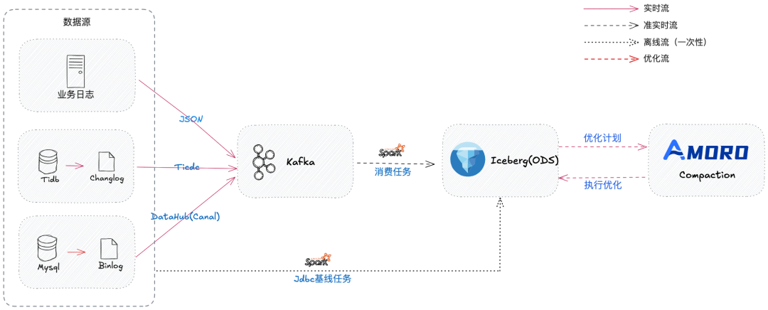 在引入 Iceberg 后,我们遇到了一些问题,如快照过期清理、MOR 模式写入产生大量小文件和 Delete 文件、写入失败产生孤儿文件等。如果使用 Iceberg 官方提供的 Compaction 运行 Spark 任务来解决这些问题,将难以长期和及时地保障 Iceberg 的可用性,同时也会大大增加后续的维护工作。幸运的是,我们发现了 Arctic(当时还未改名为 Amoro),能够解决我们引入 Iceberg 后遇到的相关难题。