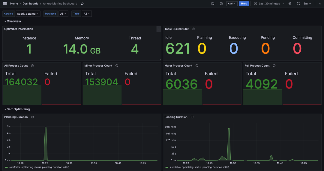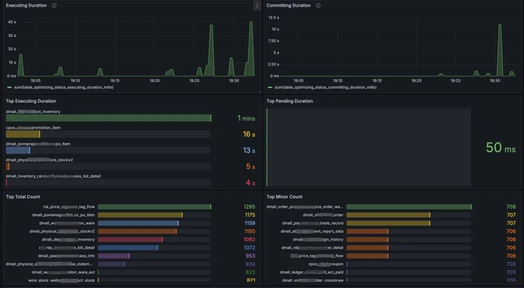 经过分析,我们利用社区提供的Metrics模块,通过 Prometheus 进行采集,自主研发了 Grafana 上的可视化图表,可以直观的展示优化器状态信息和优化文件的处理信息。