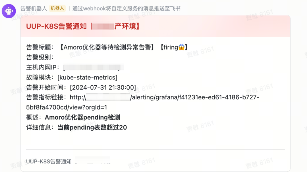 除此之外,我们也设计配置了 Grafana 规则,对接内部飞书告警,及时通知异常情况进行人工介入。