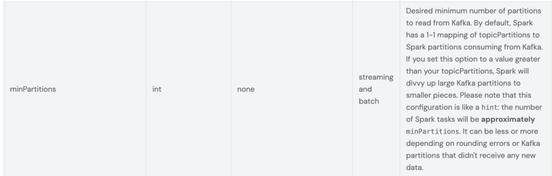 我们的 Kafka 服务端版本为 2.3.4,采用 Spark 提供的 Kafka 0.10+ Source for Structured Streaming 的方式读取数据。如果想解决由于 Topic Partition 分布不均导致的读取速度慢的问题,可以考虑增大 minPartitions 值。