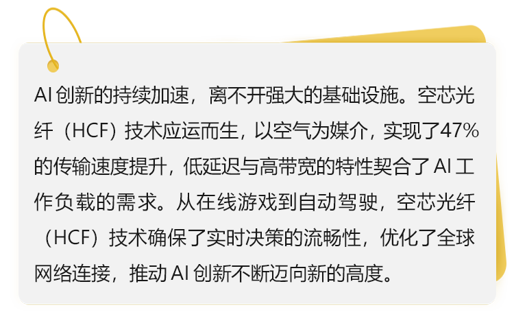 对于自动驾驶、视频流、在线游戏及智能设备等需要实时或近实时响应的AI应用场景而言,网络的快速响应和低延迟至关重要。这些应用需要在极短时间内处理大量数据并作出决策,因此,任何网络延迟或中断都可能导致性能下降或用户体验受损。低延迟和高速网络连接确保了数据能够迅速、准确地传输至AI模型,使其能够即时处理并返回结果。以自动驾驶轿车为例,它展示了AI技术在现实世界中的应用,依赖于AI模型在不可预测的环境中迅速识别物体、预测运动并规划路线。低延迟和高速连接促进了数据的快速处理和传输,实现了近乎实时的决策制定,从而提高了安全性和性能。空芯光纤(HCF)技术能够加速AI性能,为AI模型和应用提供更快速、更可靠、更安全的网络连接。