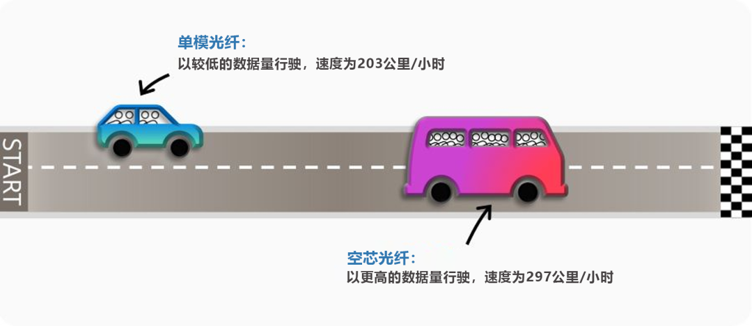 光在空气中的传播速度比玻璃中快,因此空芯光纤(HCF)比标准石英玻璃光纤快47%,从而提供了更高的整体速度和更低的延迟。此外,每根HCF光纤还具有更高的带宽。但速度、延迟和带宽之间有何区别呢?速度是指数据在光纤介质中传播的速度,而网络延迟则是指数据在网络中两个端点之间传输所需的时间。延迟越低,响应时间越快。另外,带宽是指在网络中发送和接收的数据量。想象一下,有两辆车同时从A点出发前往B点。第一辆车是轿车(代表单模光纤SMF),第二辆车是面包车(HCF)。两辆车都载着乘客(即数据),轿车可以载4名乘客,而面包车可以载16名。两辆车可以达到不同的速度,面包车比轿车行驶得更快。这意味着面包车到达B点所需的时间更短,因此会先到达目的地,体现了更低的延迟。