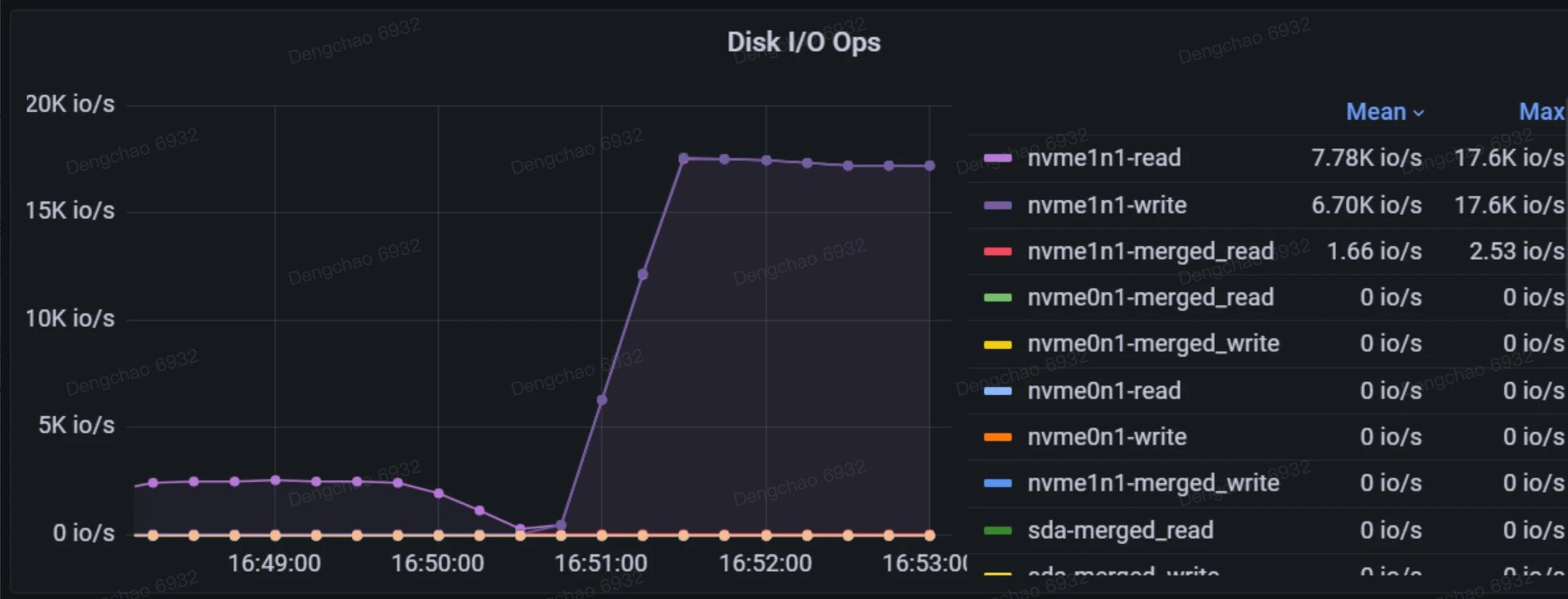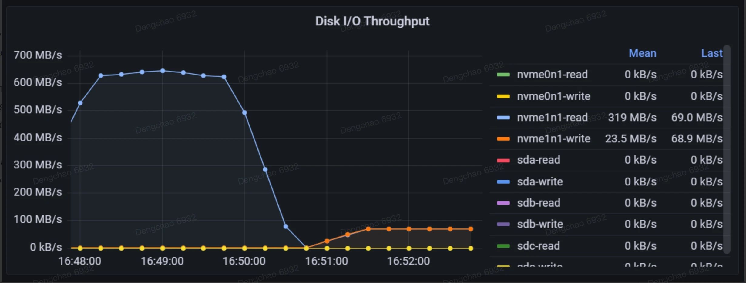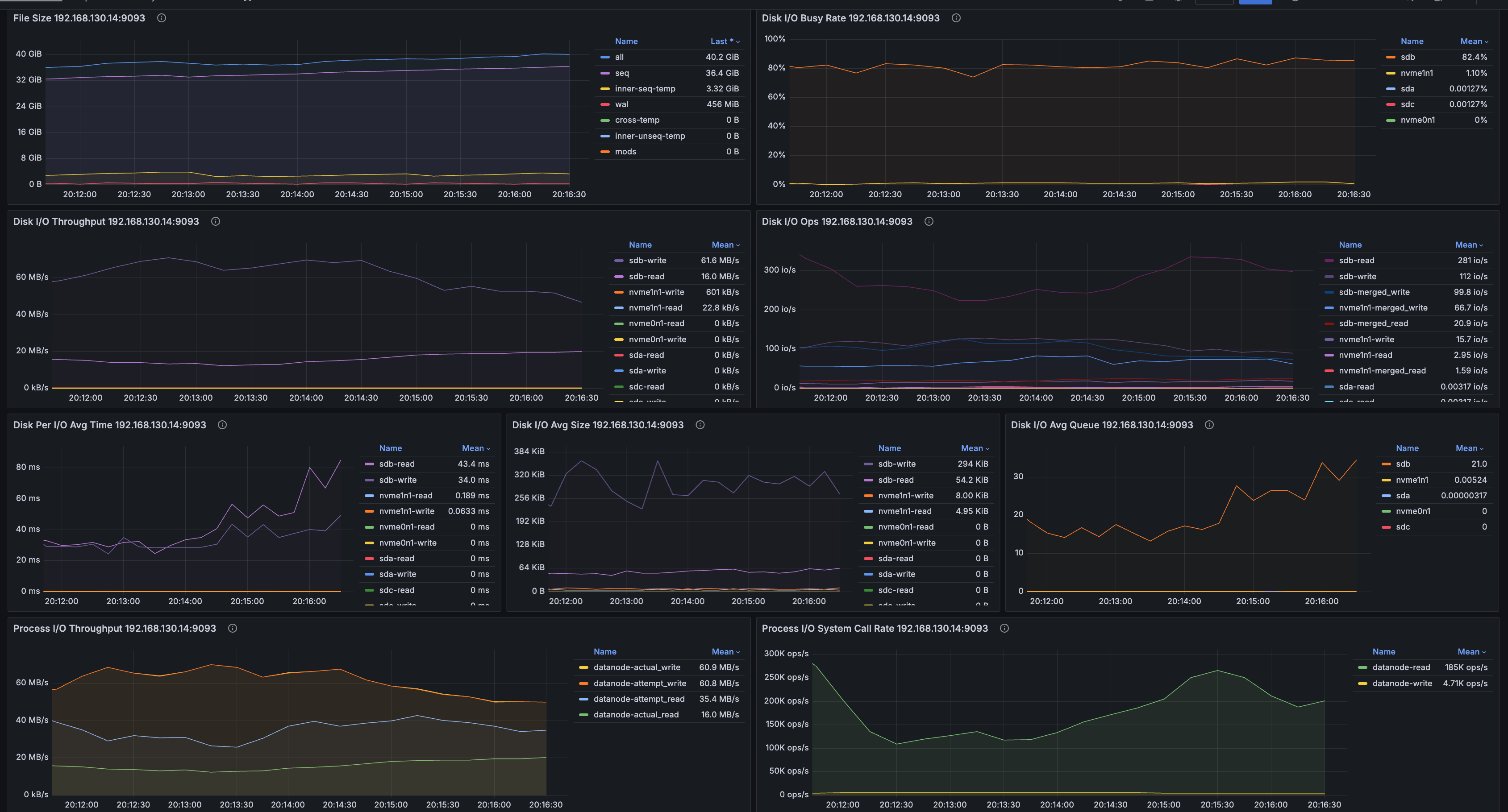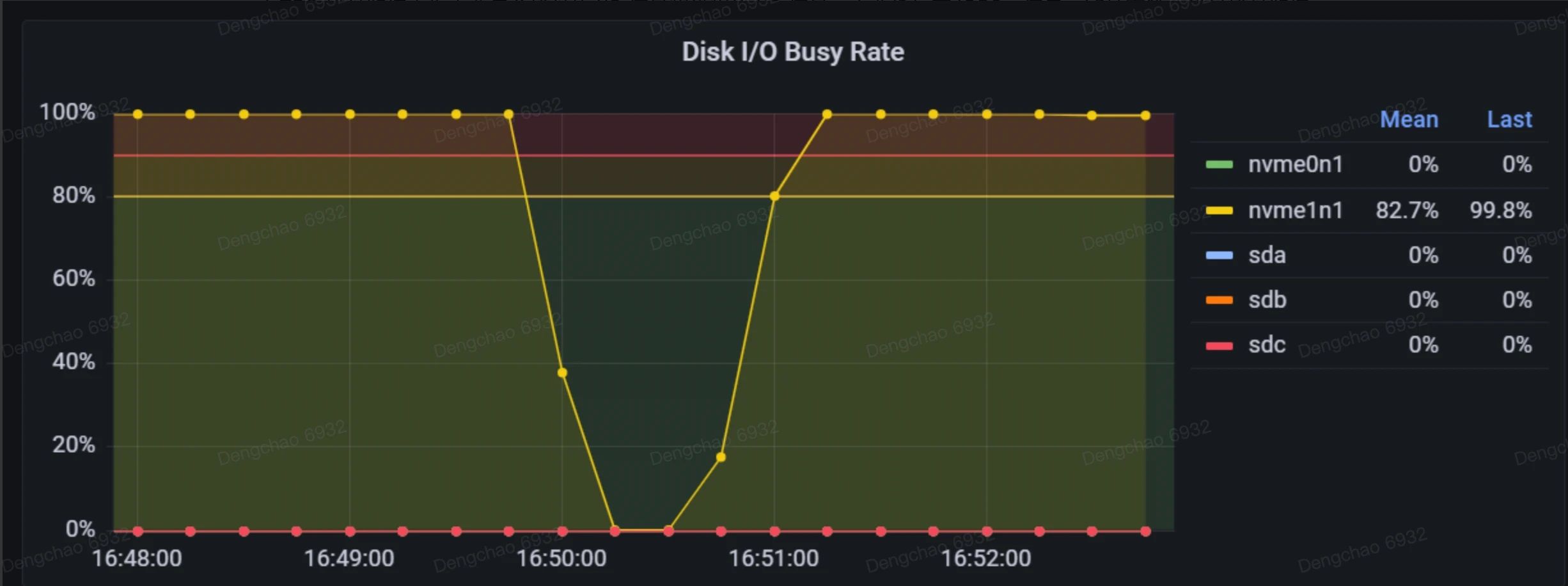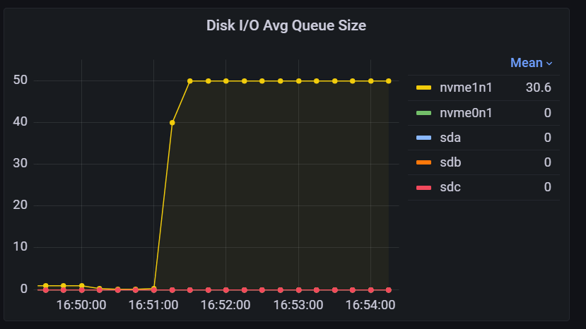 该指标记录了磁盘在每个时刻的繁忙程度,类似于 iostat 工具中的 %util 指标。右侧不同颜色的矩形块代表不同的磁盘,其中前缀 "nvme" 表示这些磁盘使用了 NVMe(非易失性内存快速存储)技术。"Mean" 和 "Last" 分别表示平均 I/O 繁忙比例和最近一次的 I/O 繁忙比例。