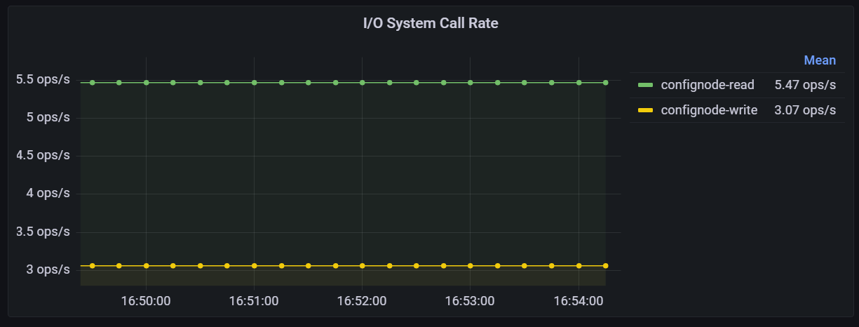 该指标表示进程调用读写系统调用的频率,类似于 IOPS。由于操作系统中存在文件系统和页面缓存(Page Cache),进程发起的系统调用不一定会立即触发实际的 I/O 操作,因此 I/O System Call Rate 通常高于磁盘的实际 IOPS。虽然该指标的绝对值可能难以直接解读,但通过观察其历史数据波动,可以帮助分析 IoTDB 的 I/O 模式是否发生了变化,例如读写比例等方面的变化。