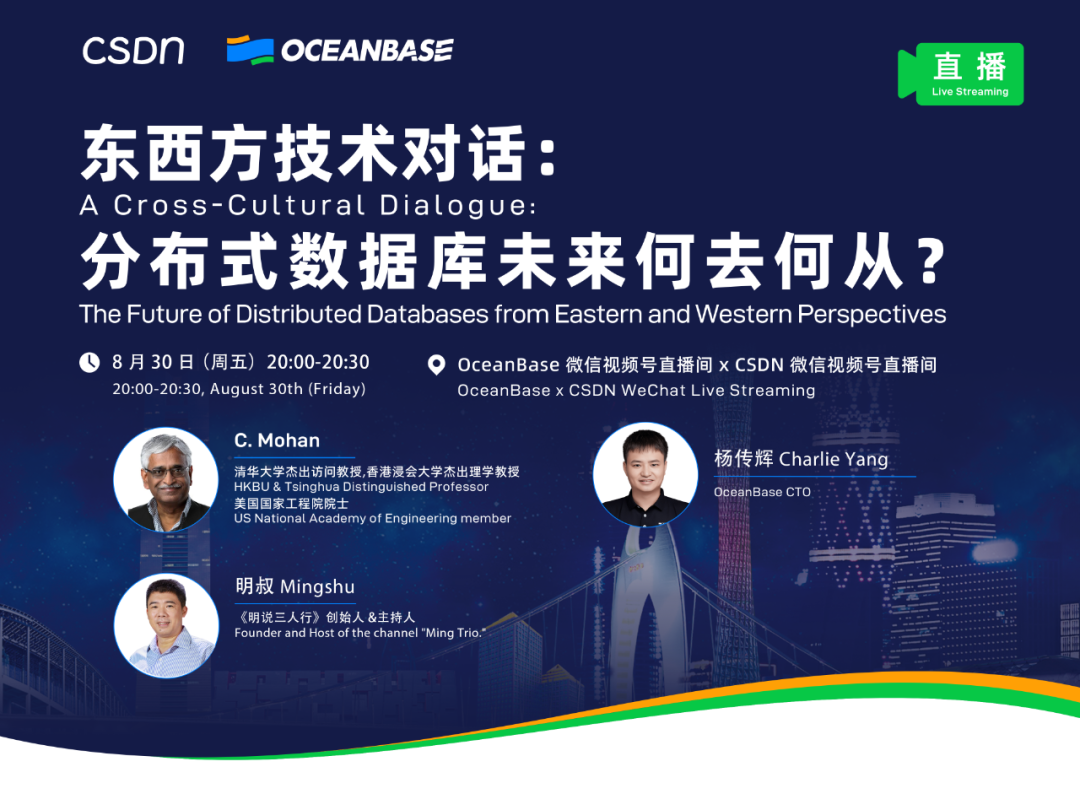 CSDN 携手 OceanBase,特邀重量级嘉宾清华大学杰出访问教授、美国国家工程院院士 C.Mohan 做客微信视频号直播间,对话 OceanBase CTO 杨传辉,更有《明说三人行》创始人&主持人明叔(卢东明)出席坐镇,共同探讨当前全球分布式数据库领域最热门的话题。以跨文化的视角,带来一场东西方数据库领域最前沿观点的对话、碰撞与融合。